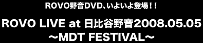 ROVO「宇宙の日」DVD、いよいよ登場!! ROVO主催で、ゴールデンウィークの恒例となった、日比谷野音でのMDTフェスティヴァル(通称“宇宙の日”)のLIVE DVDがいよいよ登場!毎年、最高のラインナップと極上の環境で、至福の時間を約束するROVOの、2008年5月5日のLIVEの模様を完全収録。開催6年目にして、すべてが最高レベルとなったこの日、ROVOリーダー勝井祐二 (Vln) も「今日が一番楽しかった」とMCした、まさに伝説のLIVE!新旧おりまぜたROVOベストセレクションでつむぐ音と光の物語は、時間と空間と日常を超え、大空へと舞い上がる宇宙旅行。巨大な日比谷野音に直接映し出された、ROVOレギュラーVJ迫田悠によるファンタジックな超特大映像も圧巻。都会のオアシス、日比谷野音の風と、新緑と、最高のヴァイブスとともに、存分にお楽しみください!!